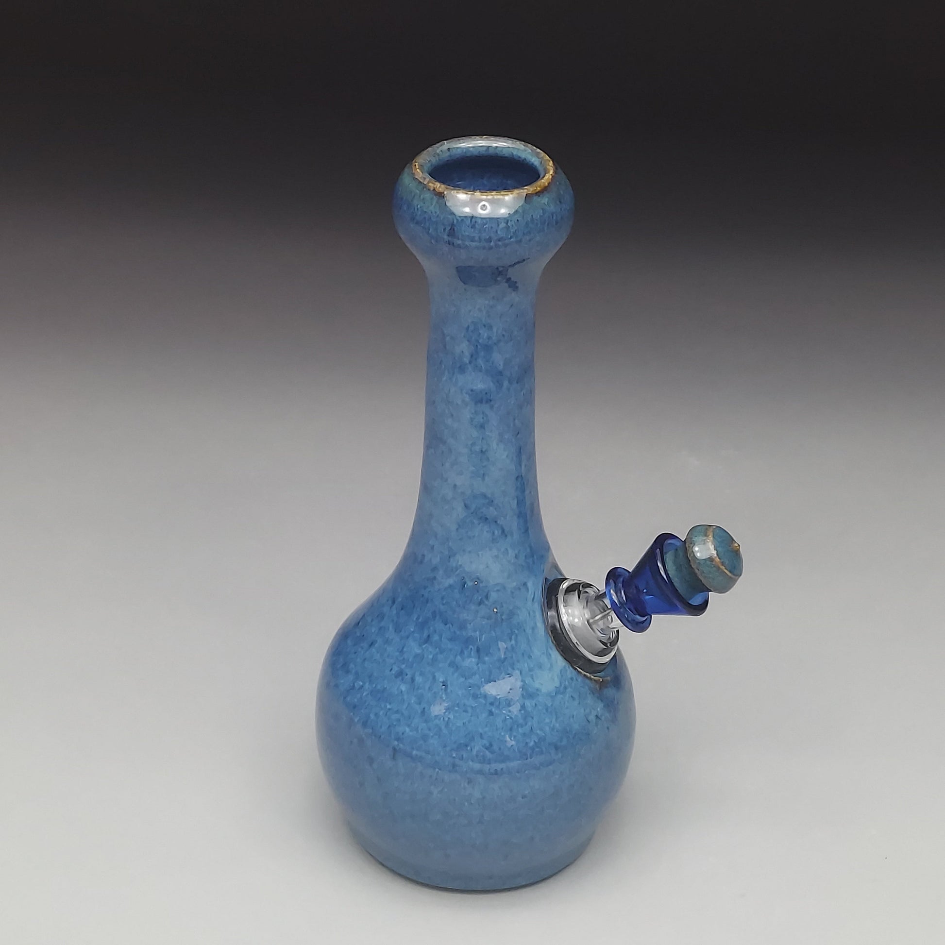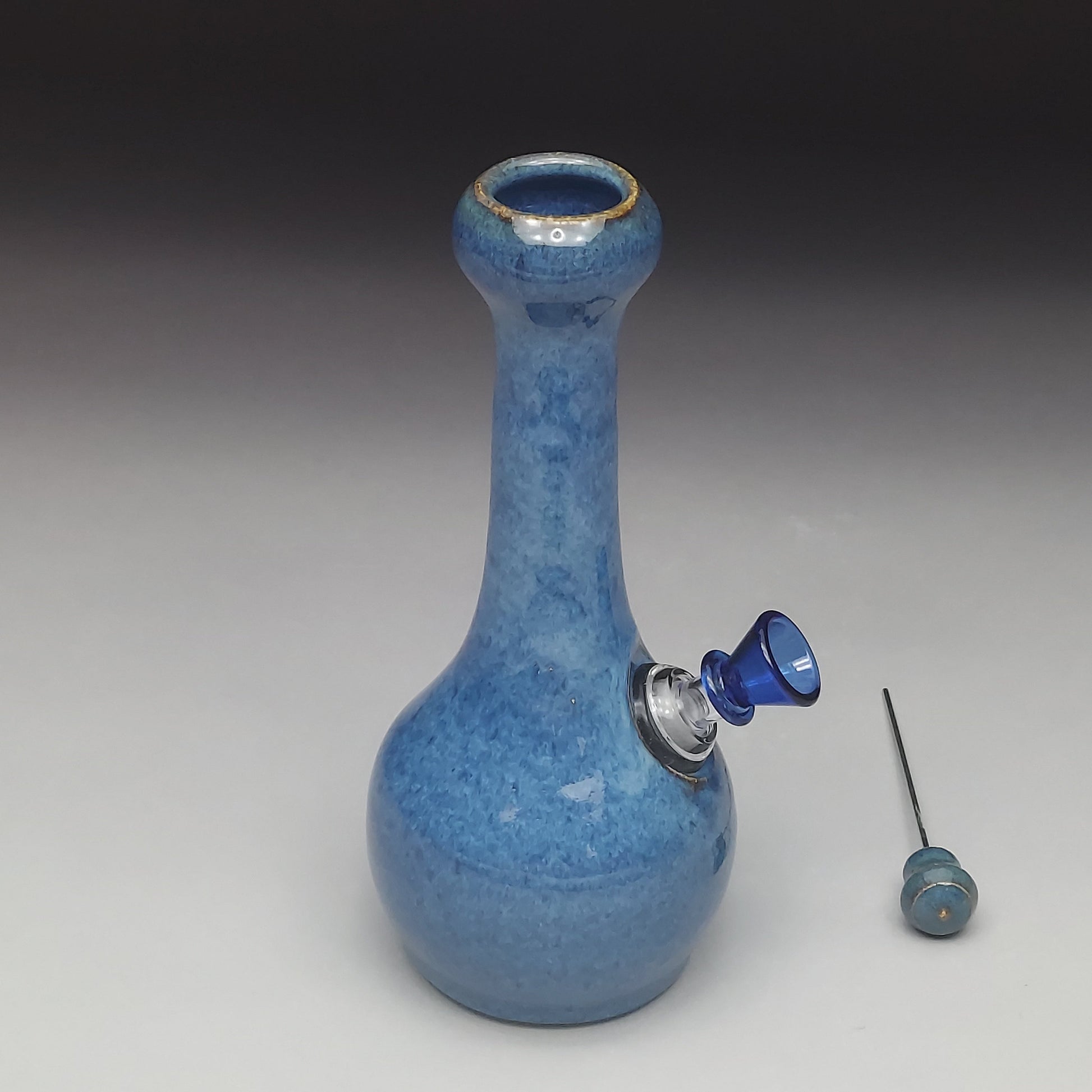 Handcrafted wheel-thrown ceramic bottle with matching poker in blue glaze. Each piece is a unique work of functional art.