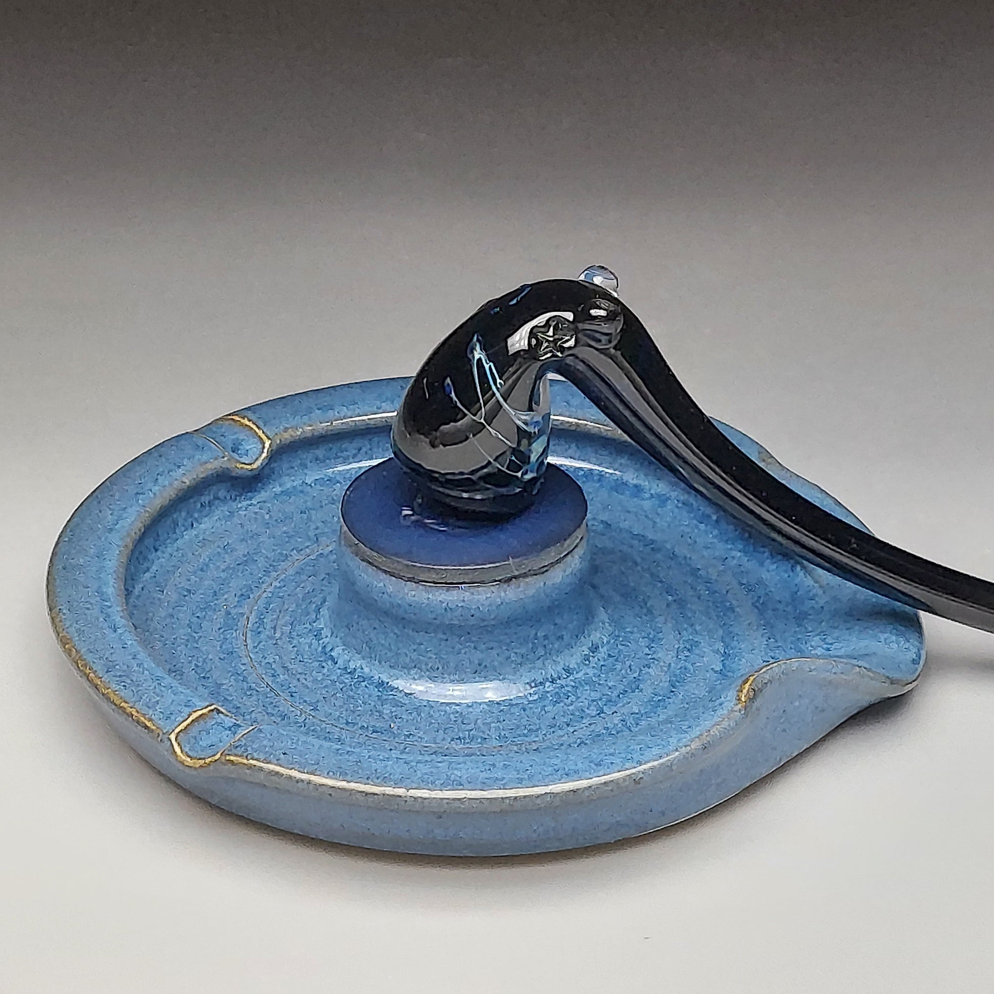 Milky Blue Wheel Thrown Ceramic Ashtray with Leather Knock out Pad with Gecko Image for Pipe Smokers