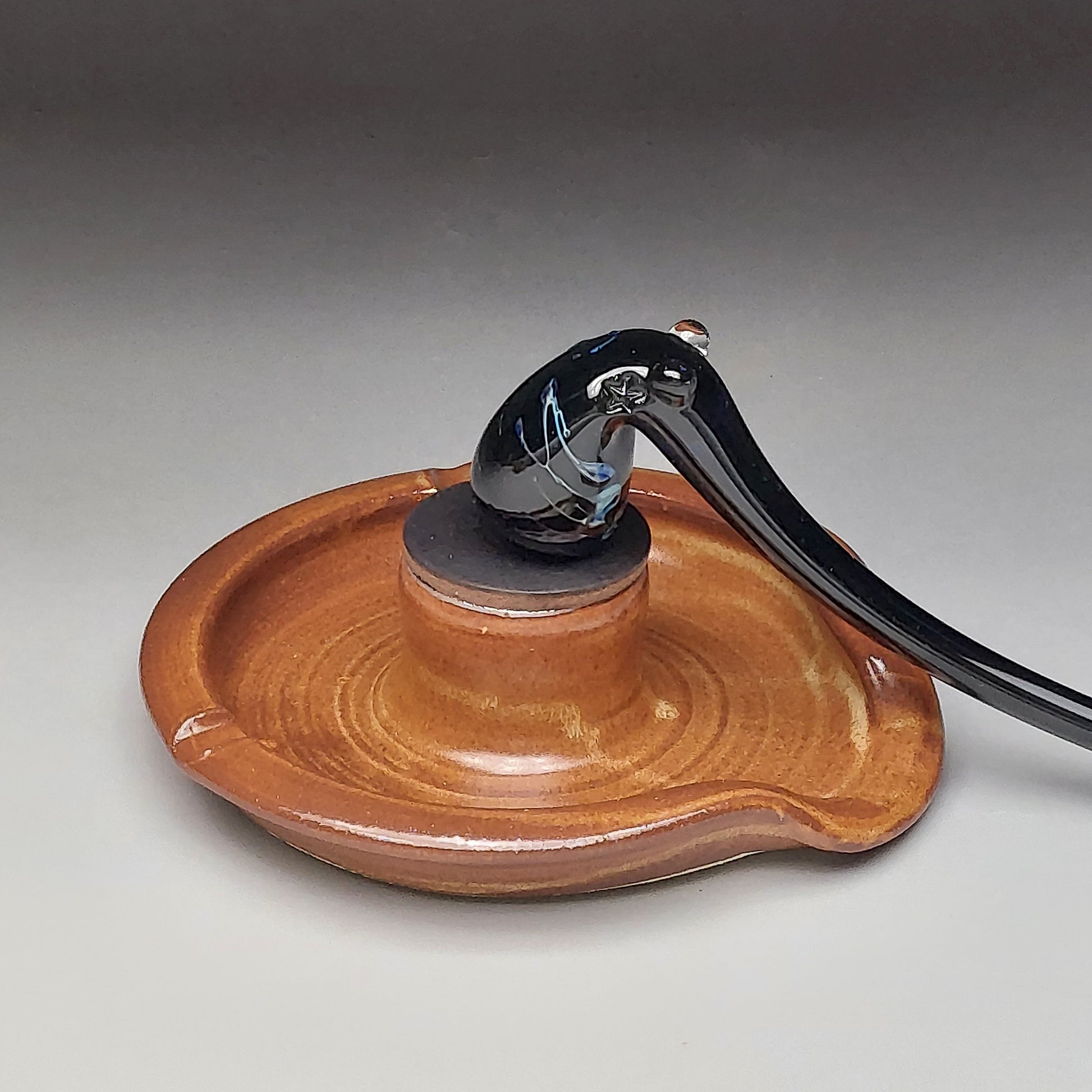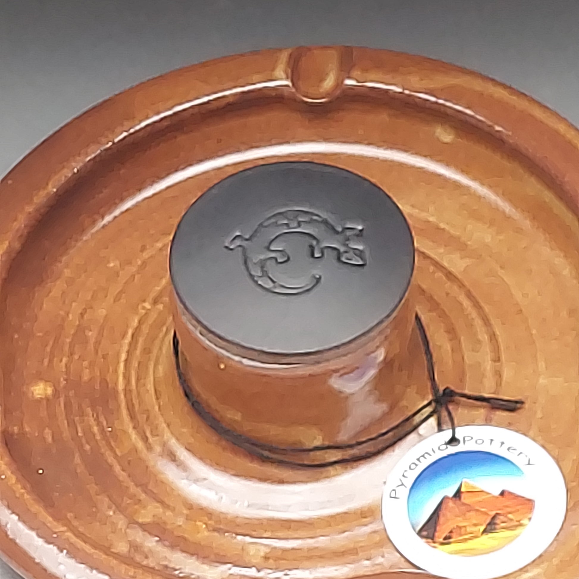 Wheel Thrown Ceramic Ashtray in a Honey Brown Glaze with Thick Leather Knock out Pad with Gecko decoration for Pipe Smokers.