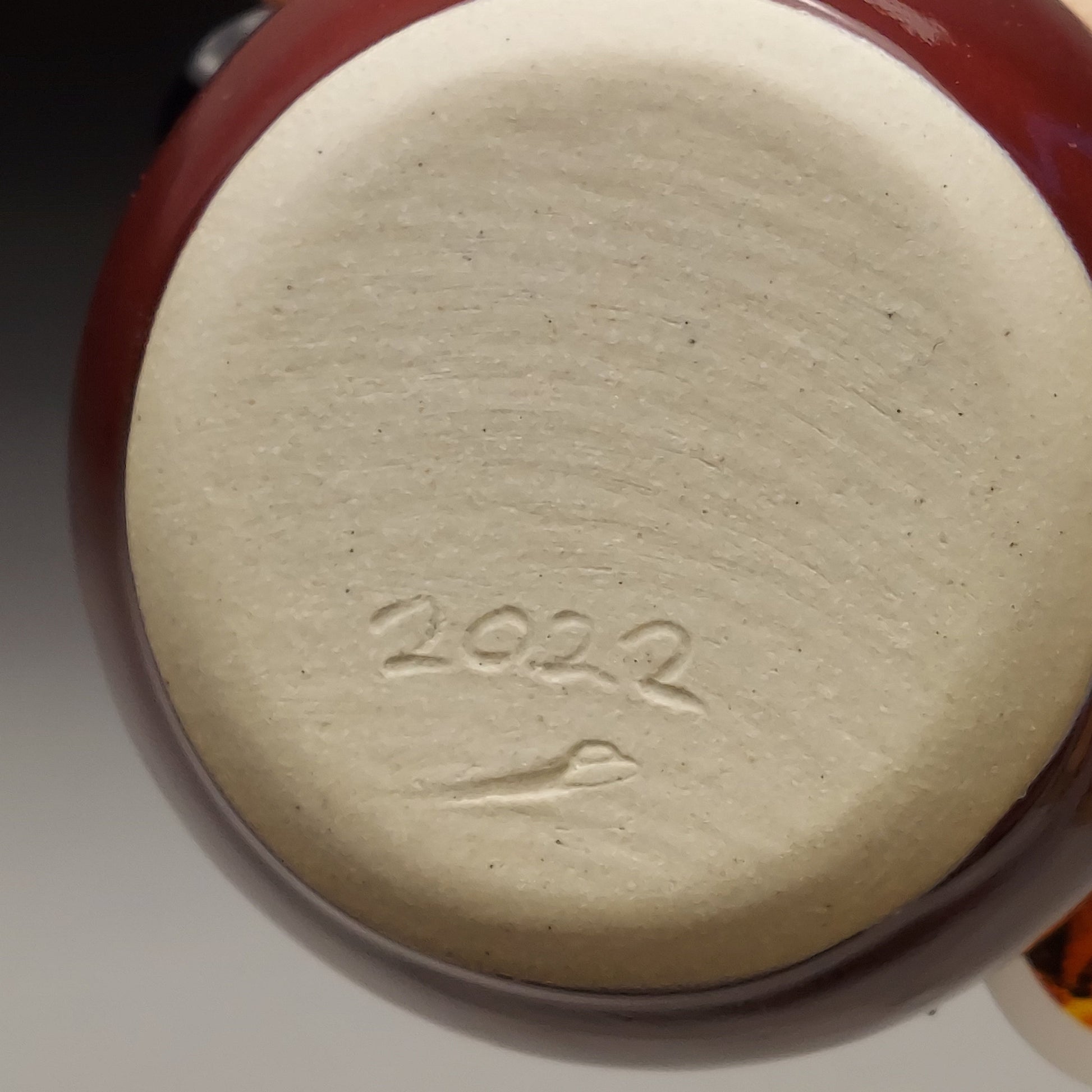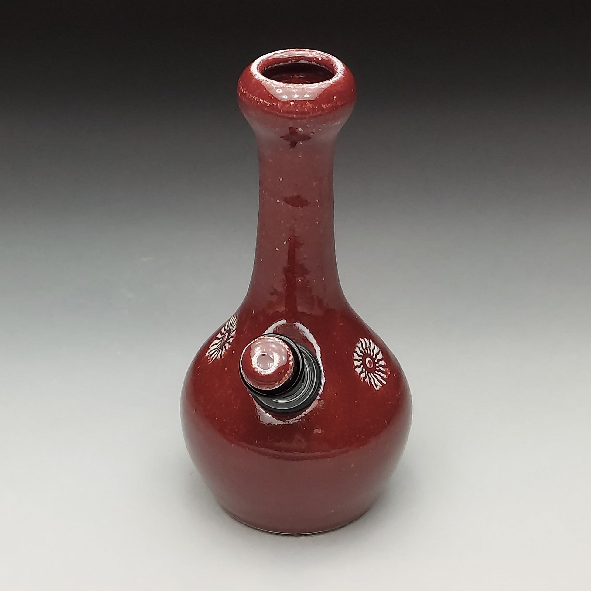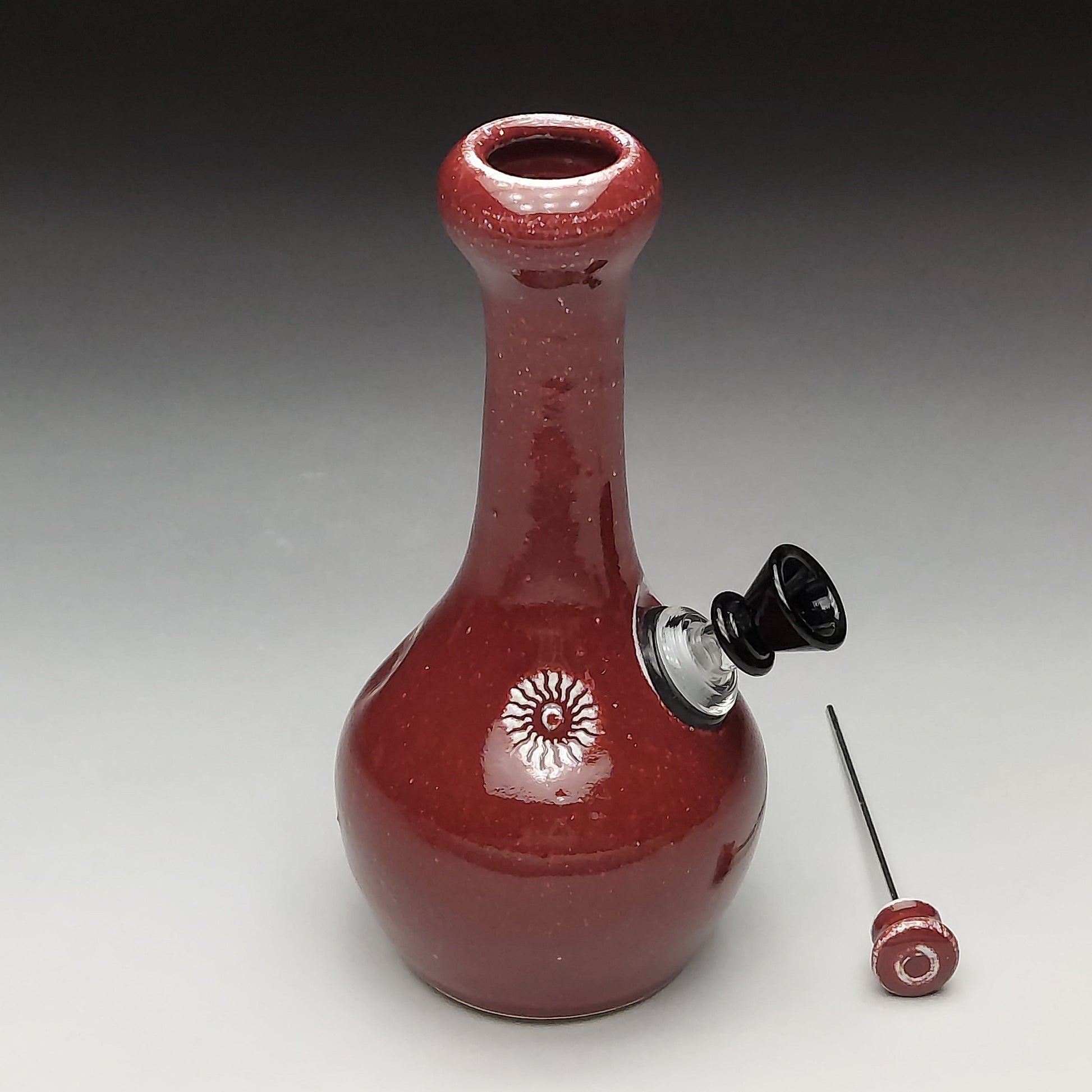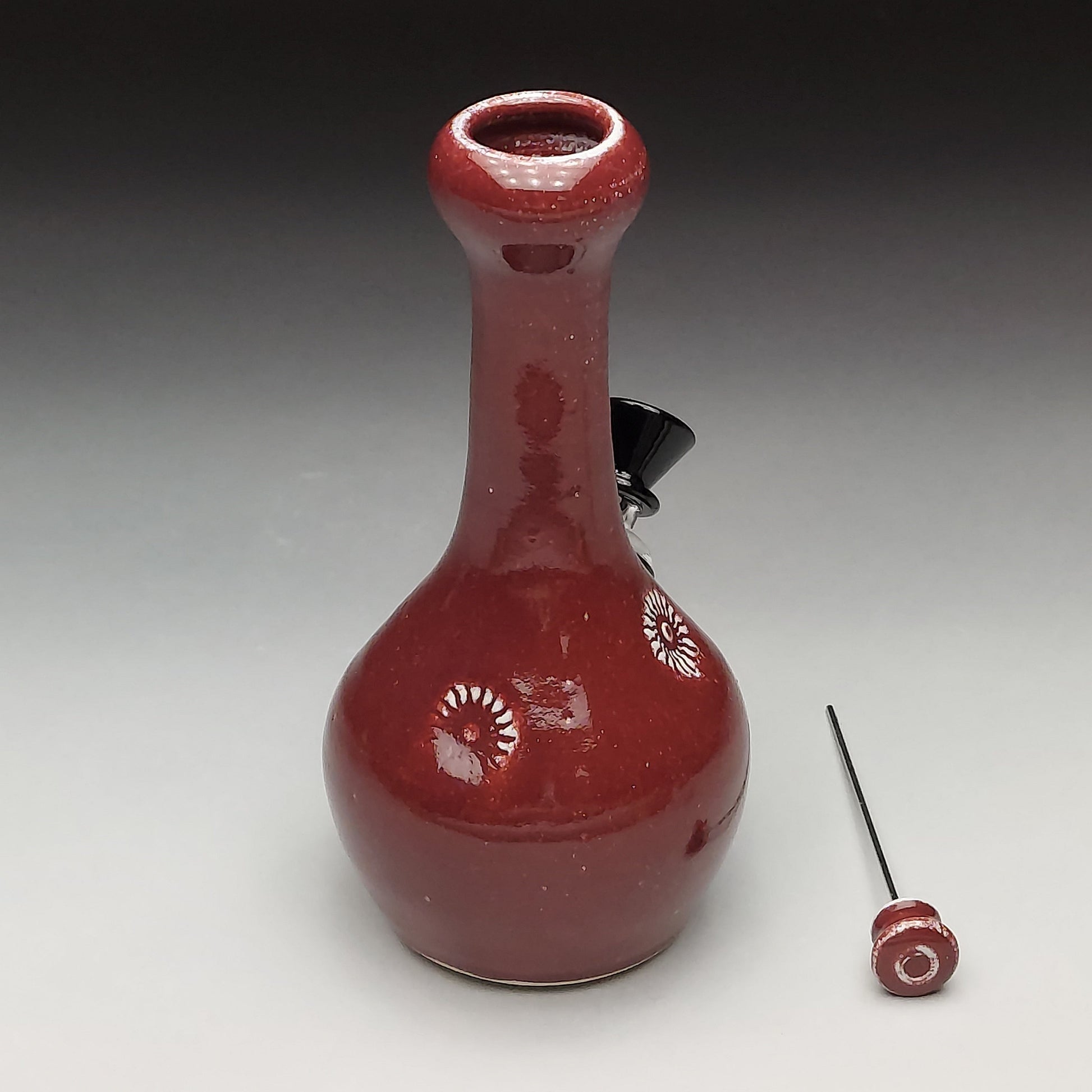 Handcrafted wheel-thrown ceramic bottle with matching poker in burgundy red glaze with sun decoration. Each piece is a unique work of functional art.
