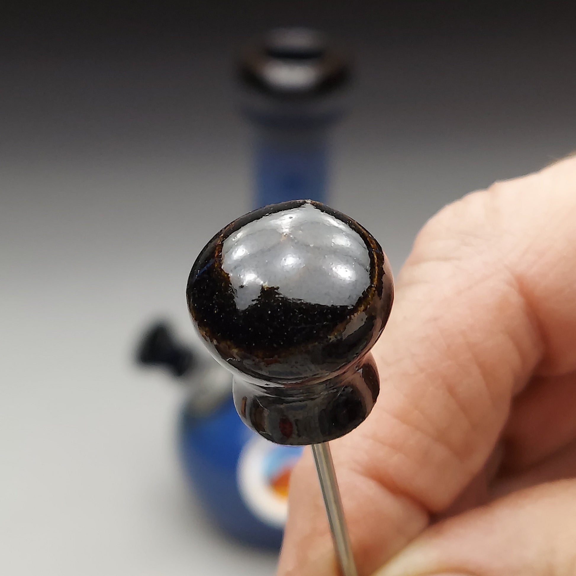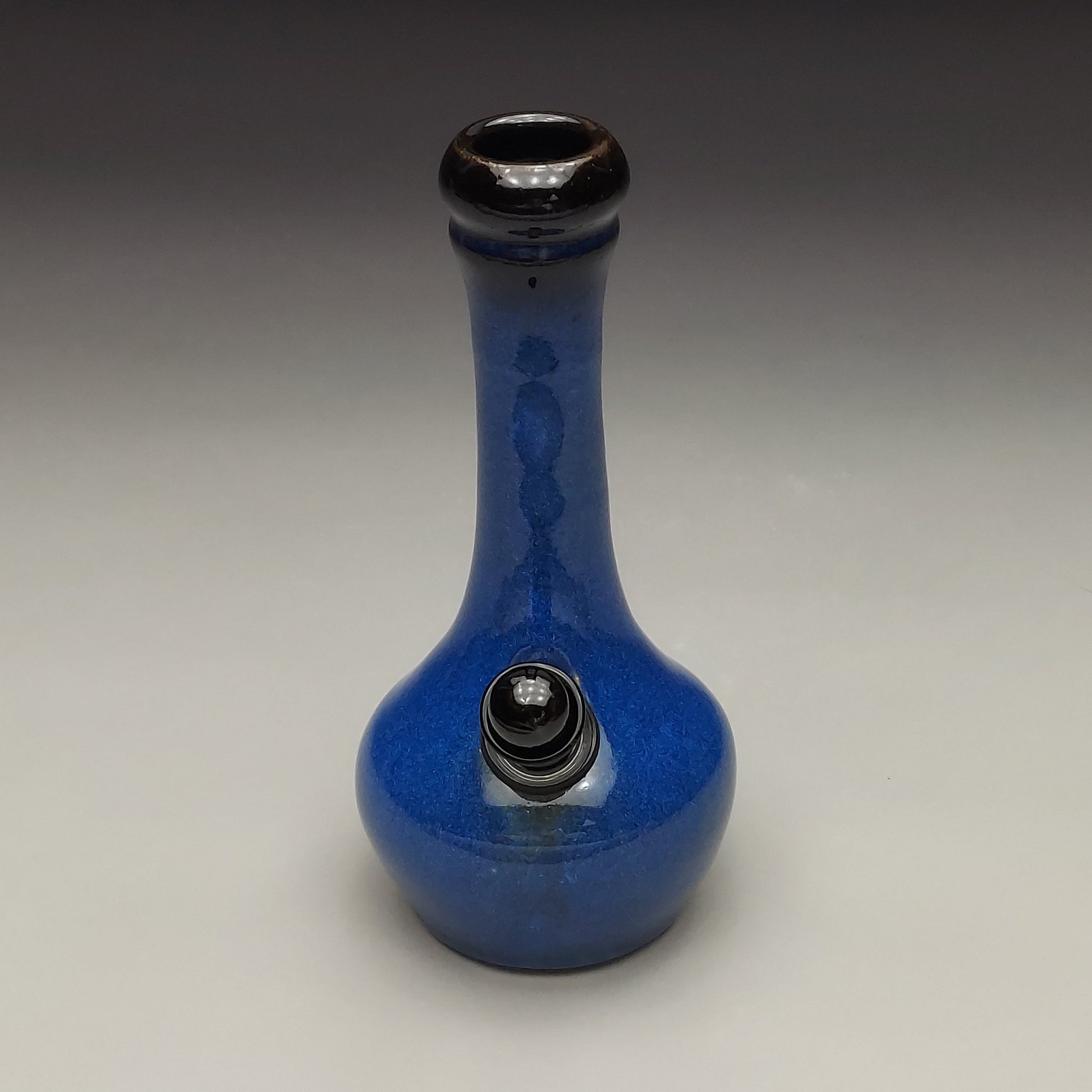 Handcrafted wheel-thrown ceramic bottle with matching black poker in blue glaze with black mouthpiece. Each piece is a unique work of functional art.