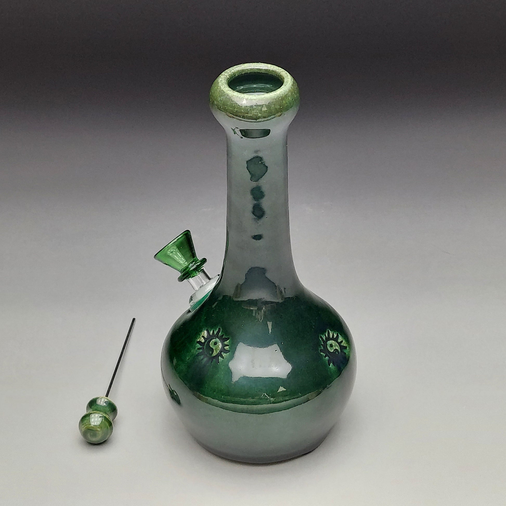 Handcrafted wheel-thrown ceramic bottle with matching poker in green glaze with Ying & Yang decoration. Each piece is a unique work of functional art.