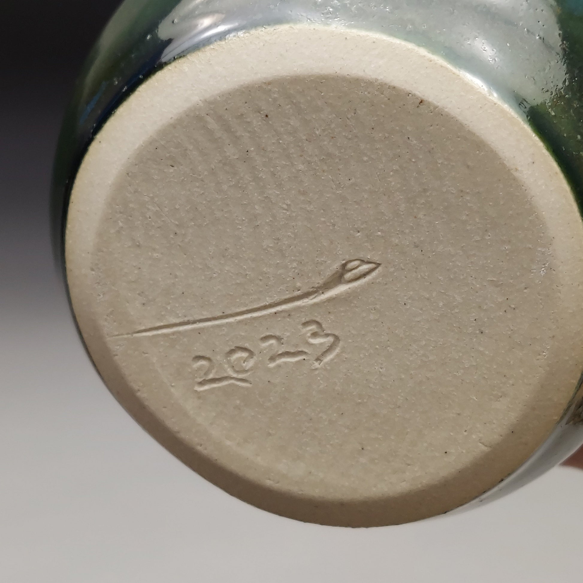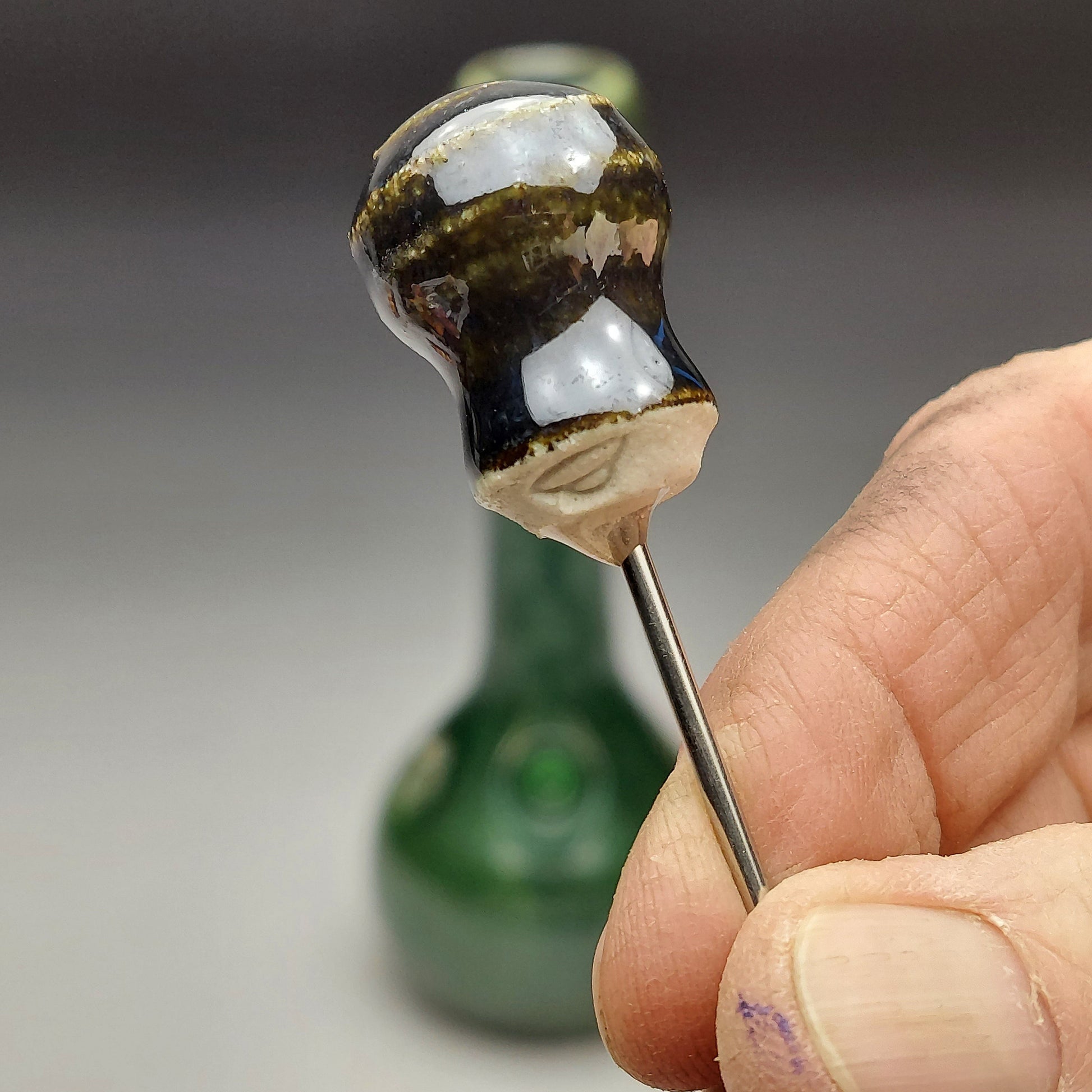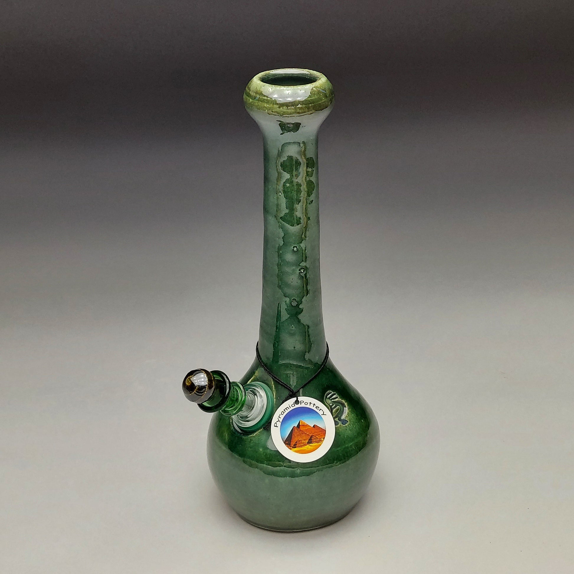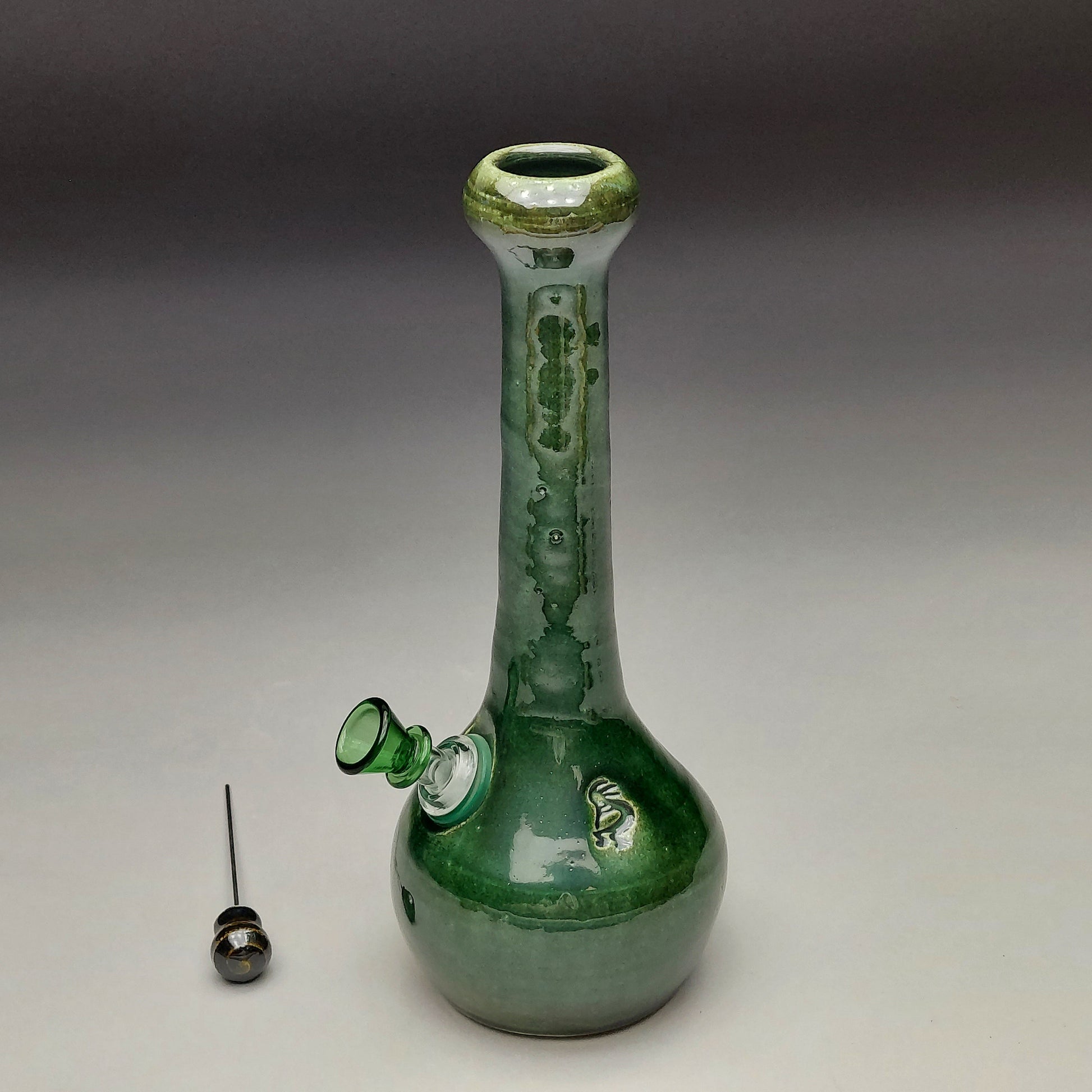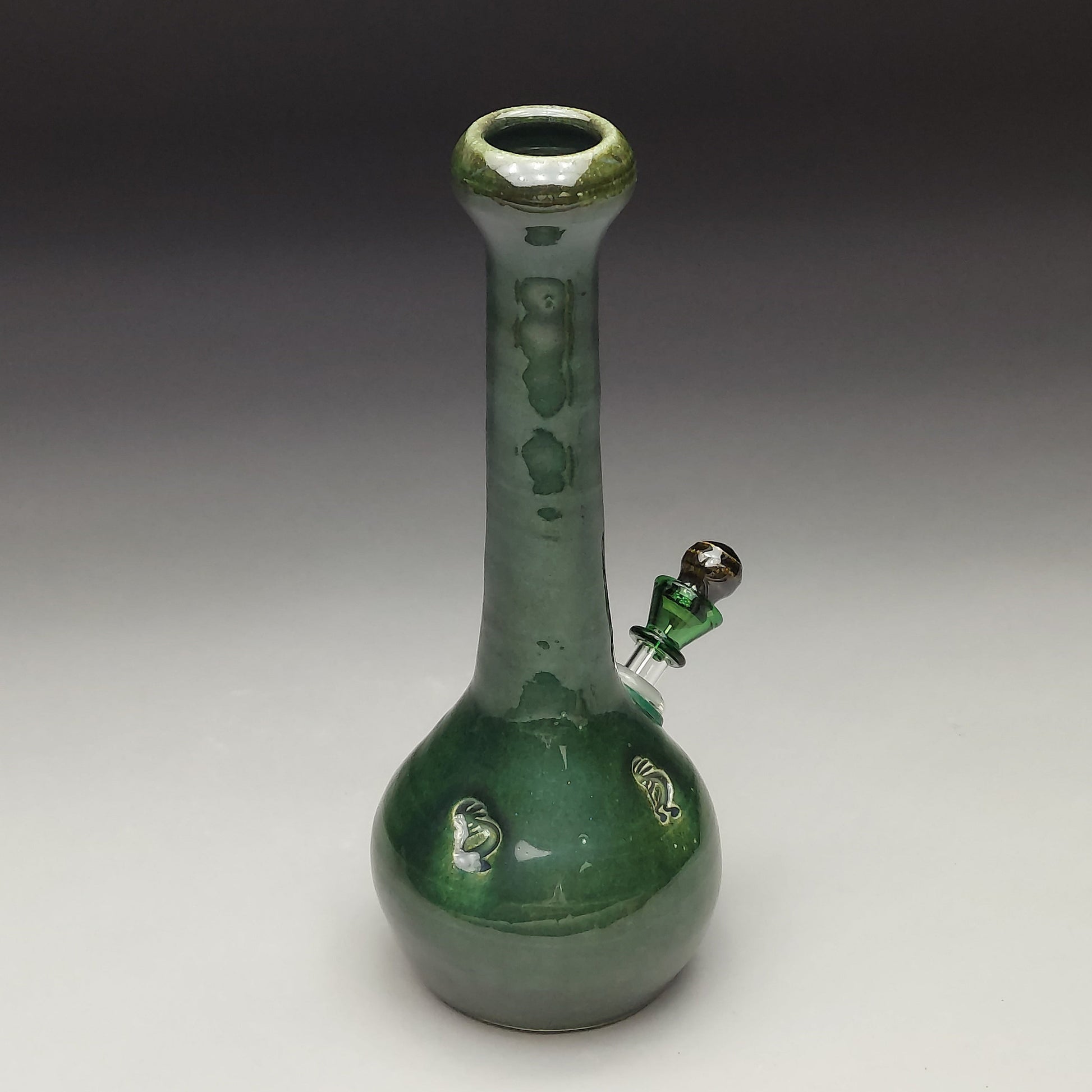 Handcrafted wheel-thrown ceramic bottle with matching poker in green glaze featuring Kokopelli decoration. Each piece is a unique work of functional art.